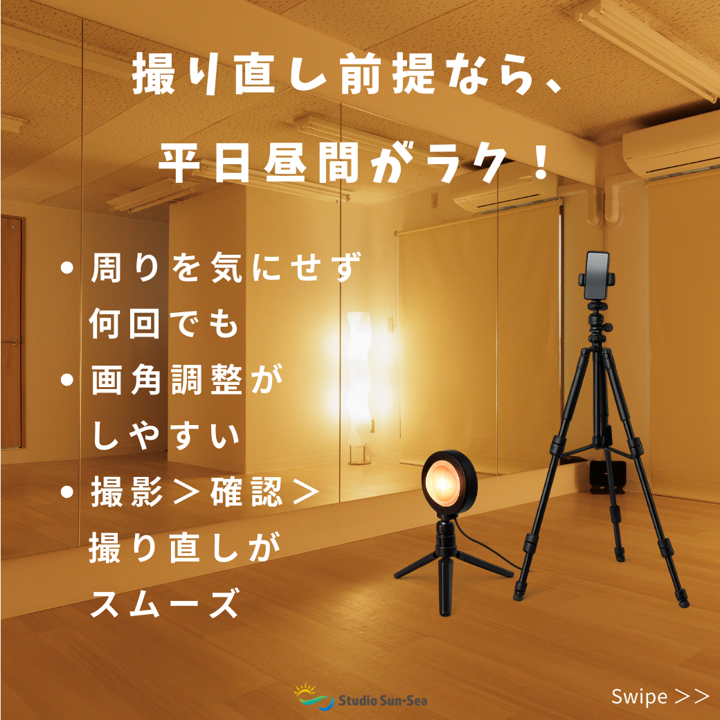 当スタジオでは、三脚およびサンセットライトなどを常設しており、手ぶらでも撮影を始めやすい環境を整えています。
