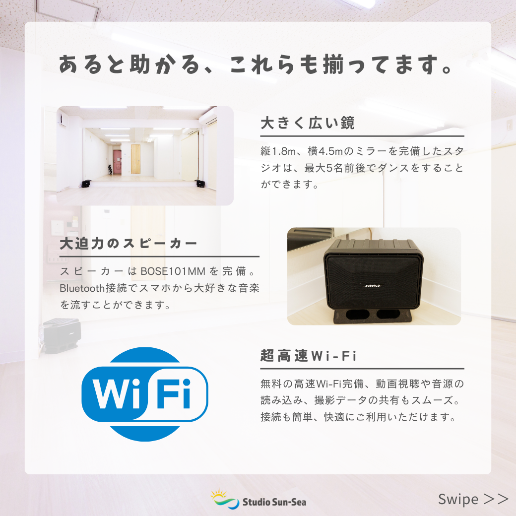 大型ミラー、音響、Wi-Fiもご利用いただけますので、ダンス動画の撮影やフォーム確認をしながらの練習にも適しています。