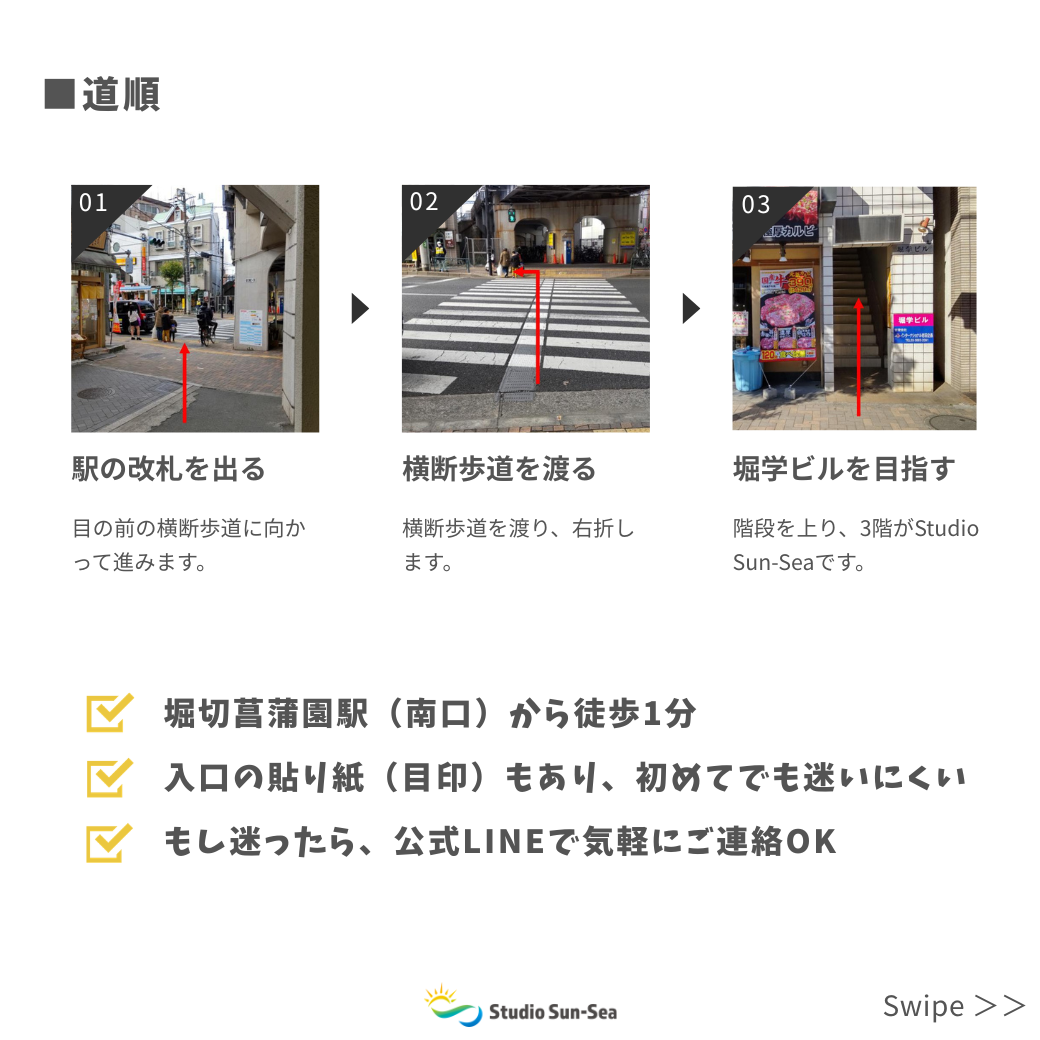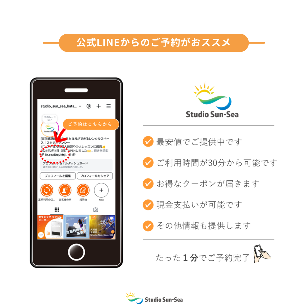 2026.02.23 【必見】思いたったら すぐ わたし時間_2026.02 こんにちは、Studio Sun-Sea(スタジオ サンシー)です。 堀切菖蒲園駅から徒歩1分のレンタルスタジオです。 初めての方でも安心してお越しいただけるよう、道順は予約確定メッセージ内に記載しております。 当日もし分かりにくい場合は、公式LINEよりご連絡ください。 ご予約は、下記の「LINEから簡単予約」より、お願いいたします。 LINEから簡単予約 初めての方も大歓迎です。皆様のご予約・ご利用を心よりお待ちしております。 ◆◇◆◇◆◇◆◇◆◇◆◇ スタジオ サンシー/Studio Sun-Sea 自宅でも職場でもなく自分の好きなことが実現できる場所、それが「スタジオ サンシー」です。 ★☆★ スタジオ サンシーの特徴 ★☆★ ●堀切菖蒲園駅から徒歩1分 ●LINEで簡単予約 ●無料超高速Wi-Fi ●利用用途に合わせた多彩な照明の演出 ●大型ミラーと大迫力スピーカー完備 ◆◇◆◇◆◇◆◇◆◇◆◇ Tweet Share 【必見】自分ペースで整う時間_2026.02 【200円OFF × 3回】平日昼限定クーポン_2026.03