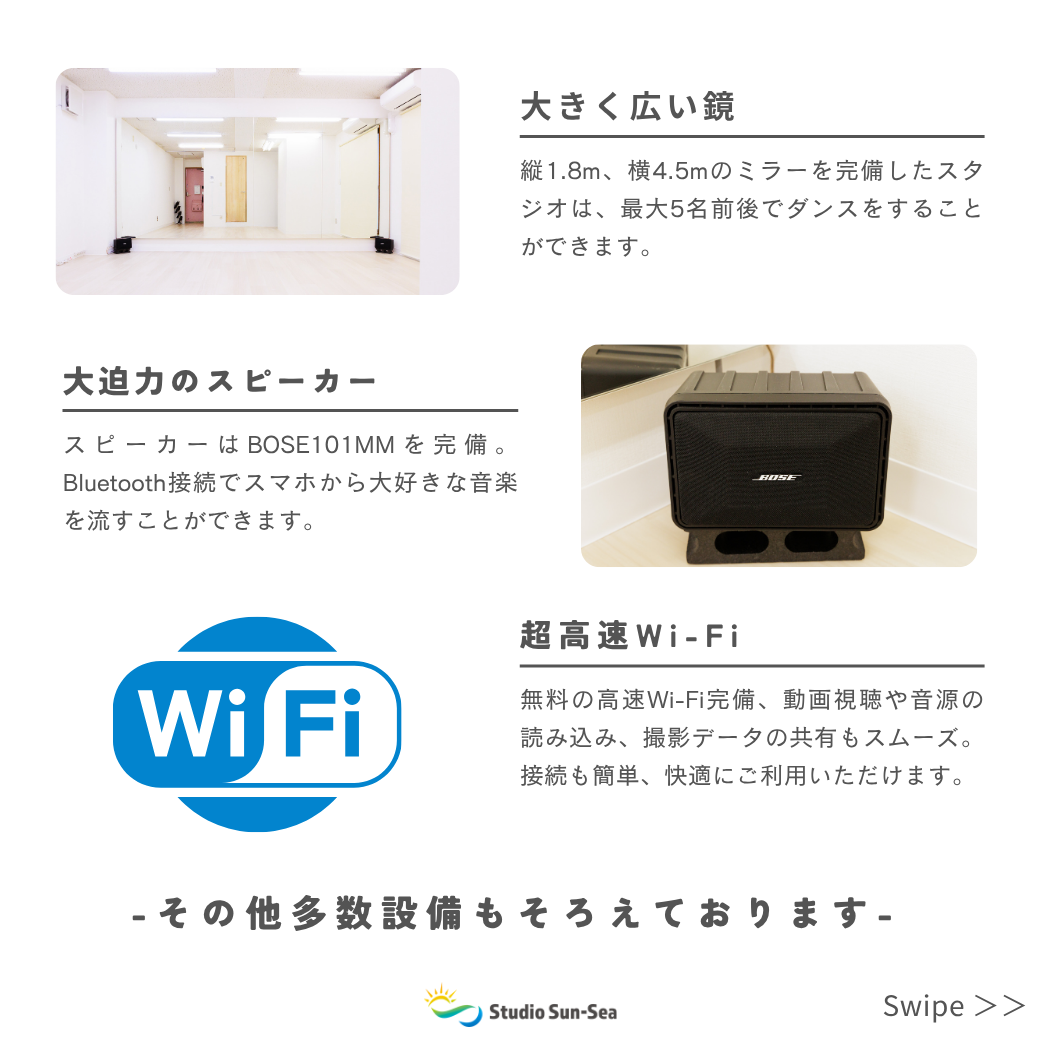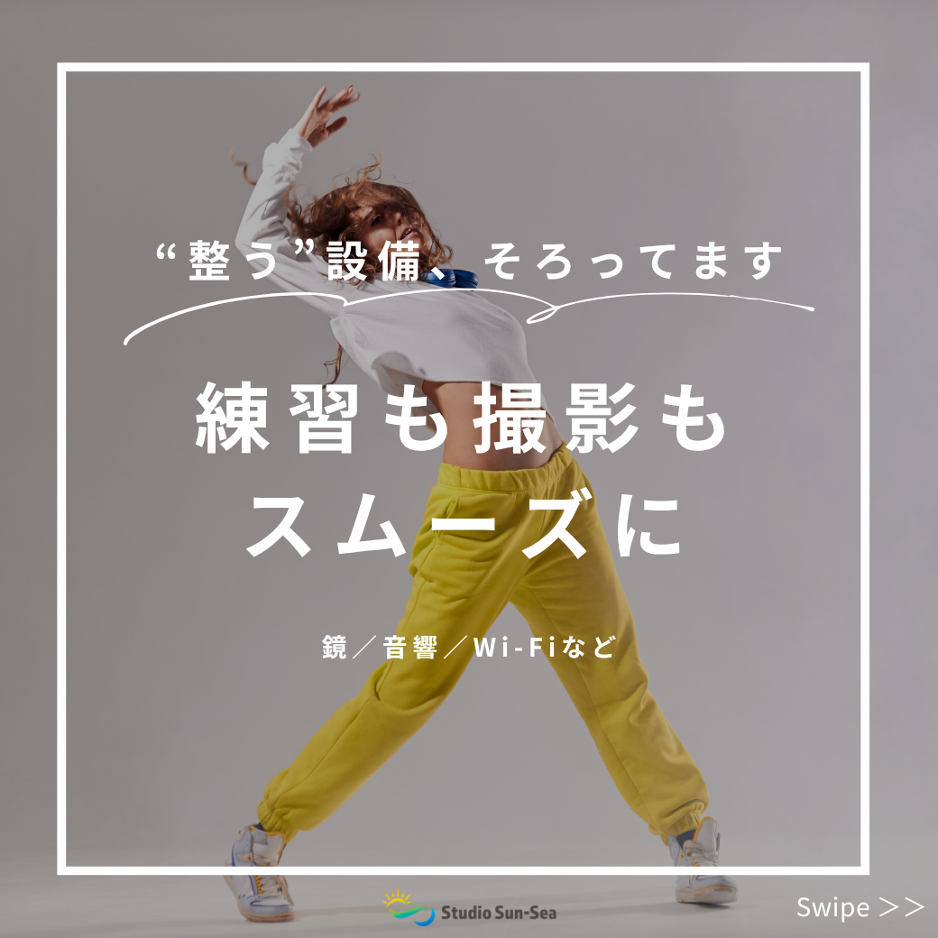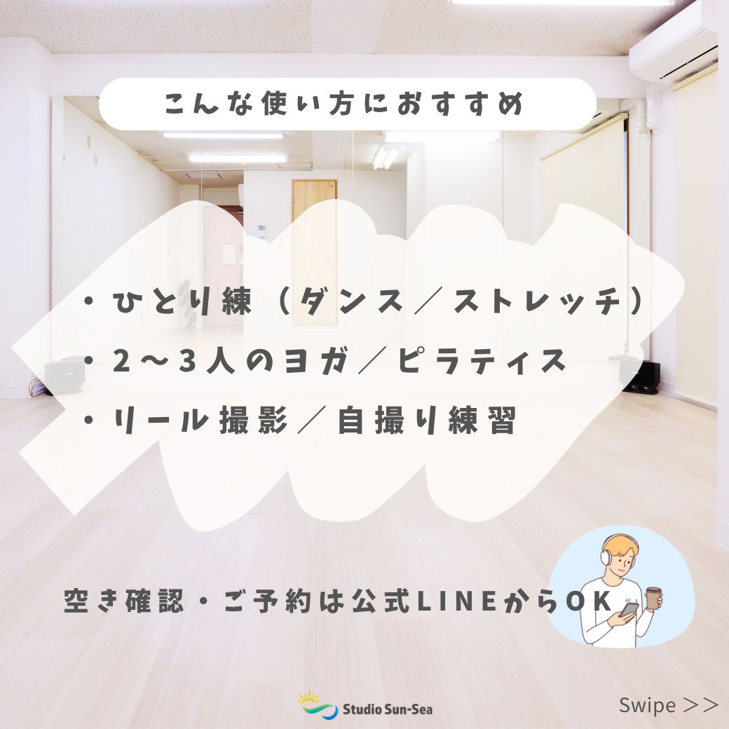 2026.04.19 【必見】練習も撮影もスムーズに_2026.04 こんにちは、Studio Sun-Sea(スタジオ サンシー)です。 Studio Sun-Seaでは、ダンス・ストレッチ・ヨガ・撮影など、さまざまな用途に対応できるよう、基本設備をシンプルかつ使いやすく整えています。 スタジオ内には、大型ミラー・音響設備・無料Wi-Fiを完備しております。 大型ミラーはフォーム確認や動きのチェックに適しており、個人練習やレッスン利用にもご活用いただけます。 音響設備は、スマートフォン等と接続しやすい設計となっており、音楽に合わせた練習や撮影においてスムーズな環境を提供します。 また、無料Wi-Fiもご利用いただけるため、撮影データの確認や共有、オンライン作業を伴う利用にも対応可能です。 「初めてでも迷わず使えること」「余計なストレスがないこと」を大切にした設計となっており、安心してご利用いただける環境を整えております。 ご予約は、下記の「LINEから簡単予約」より、お願いいたします。 LINEから簡単予約 初めての方も大歓迎です。皆様のご予約・ご利用を心よりお待ちしております。 ◆◇◆◇◆◇◆◇◆◇◆◇ スタジオ サンシー/Studio Sun-Sea 自宅でも職場でもなく自分の好きなことが実現できる場所、それが「スタジオ サンシー」です。 ★☆★ スタジオ サンシーの特徴 ★☆★ ●堀切菖蒲園駅から徒歩1分 ●LINEで簡単予約 ●無料超高速Wi-Fi ●利用用途に合わせた多彩な照明の演出 ●大型ミラーと大迫力スピーカー完備 ◆◇◆◇◆◇◆◇◆◇◆◇ 【60分 / 1,200円】新生活応援 平日利用キャンペーン_202...
