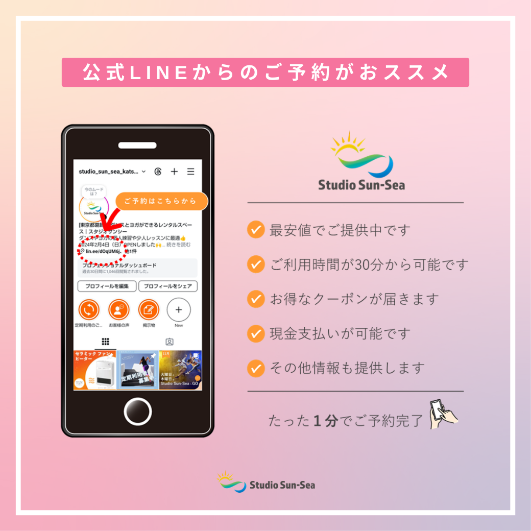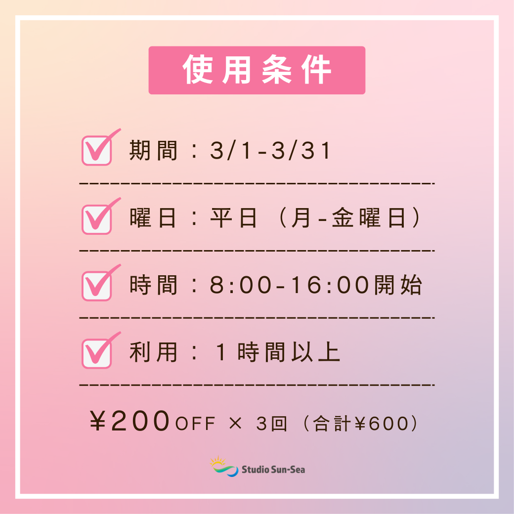 2026.02.26 【200円OFF × 3回】平日昼限定クーポン_2026.03 こんばんは、Studio Sun-Sea(スタジオ サンシー)です。 平日昼の時間を、もっと使いやすく、続けやすく。 Studio Sun-Seaでは、平日昼のご利用を後押しするために、3月限定で「平日昼クーポン(3回分)」をご用意しました。 「練習や撮影の時間を確保したいけれど、都度予約だと予定が組みにくい」 「平日昼の空いている時間に、集中して進めたい」 そんな方に向けて、“まとめて予約しやすい”ようにしています。 【平日昼クーポン(3回分)】 ・対象期間:2026年3月1日(日)〜3月31日(火) ・対象曜日:平日(月〜金曜日) ・対象時間:8:00〜16:00開始 ・利用条件:1時間以上のご利用 ・内容:200円OFF × 3回(合計600円OFF) ・予約方法:公式LINEからの予約のみ ・注意事項:他の割引・クーポンとの併用不可 当スタジオは、鏡・音響・Wi-Fiなどを備え、周りを気にせず集中しやすい環境です。はじめての方でも迷いにくいよう、入退室のご案内も整えています。 お申し込み(取得)・ご予約はご予約は、下記の「LINEから簡単予約」より、お願いいたします。 空き状況の確認から予約までスムーズに完結します。ご不明点があれば、公式LINEでお気軽にお問い合わせください。 LINEから簡単予約 初めての方も大歓迎です。皆様のご予約・ご利用を心よりお待ちしております。 ◆◇◆◇◆◇◆◇◆◇◆◇ スタジオ サンシー/Studio Sun-Sea 自宅でも職場でもなく自分の好きなことが実現できる場所、それが「スタジオ サンシー」です。 ★☆★ スタジオ サンシーの特徴 ★☆★ ●堀切菖蒲園駅から徒歩1分 ●LINEで簡単予約 ●無料超高速Wi-Fi ●利用用途に合わせた多彩な照明の演出 ●大型ミラーと大迫力スピーカー完備 ◆◇◆◇◆◇◆◇◆◇◆◇ Tweet Share 【必見】思いたったら すぐ わたし時間_2026.02