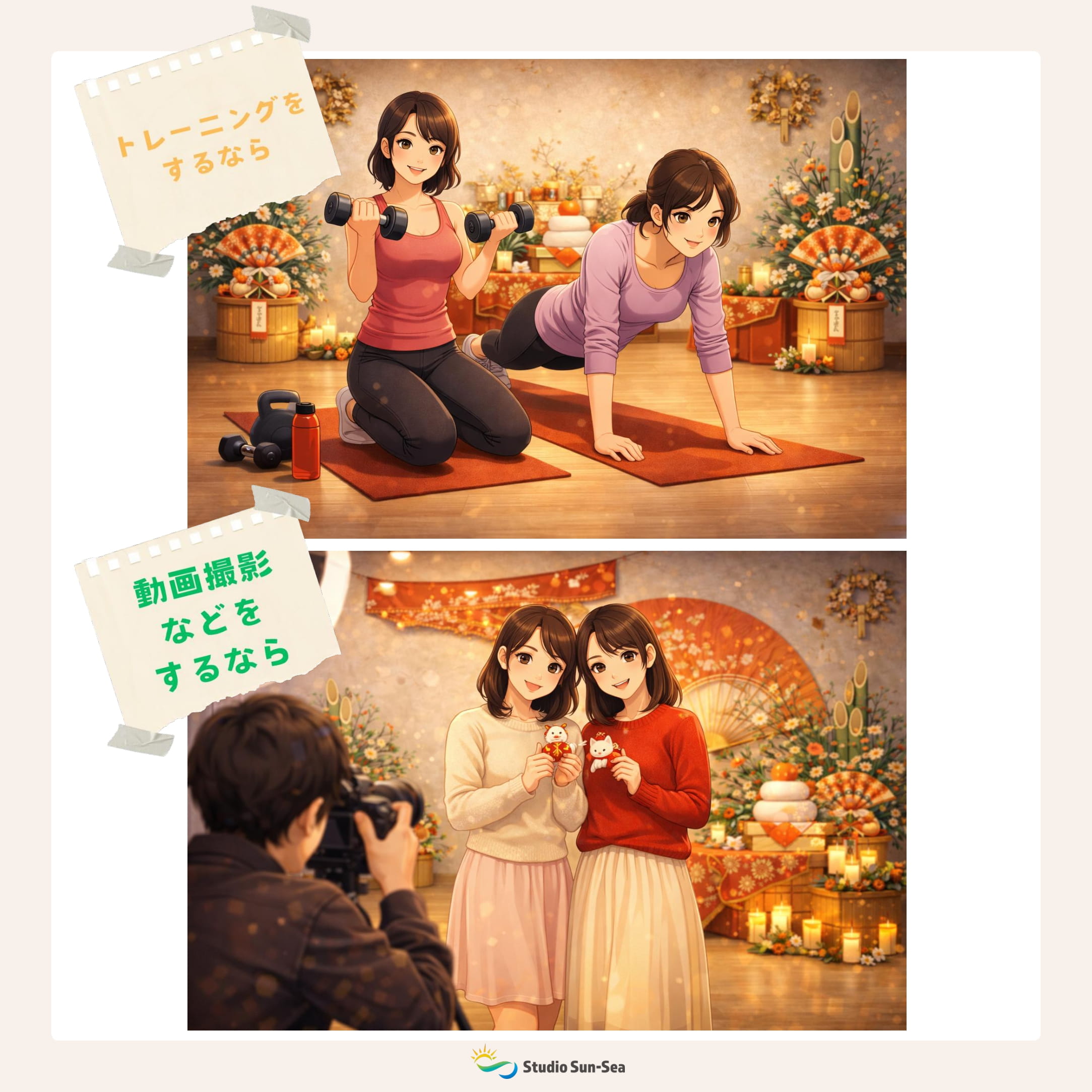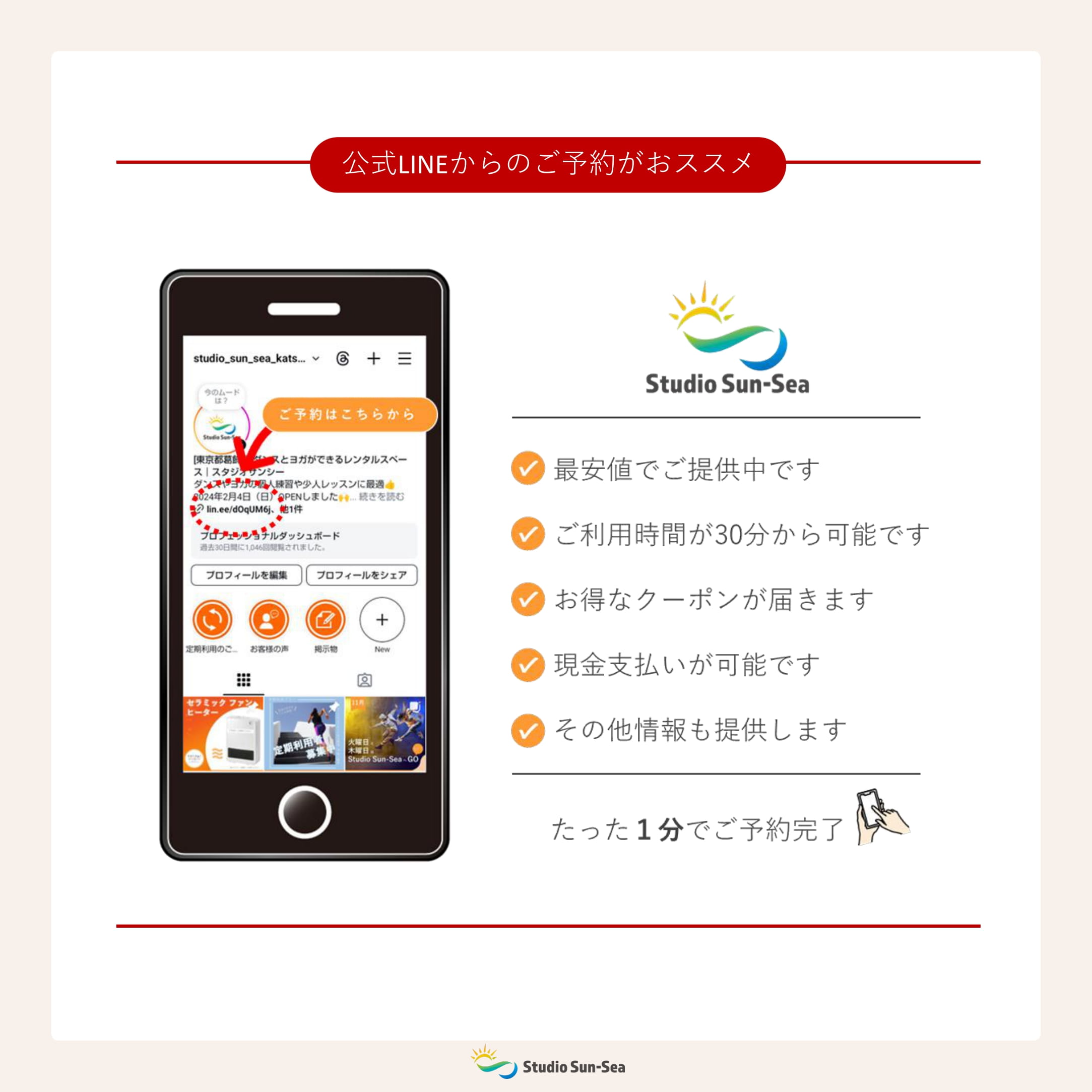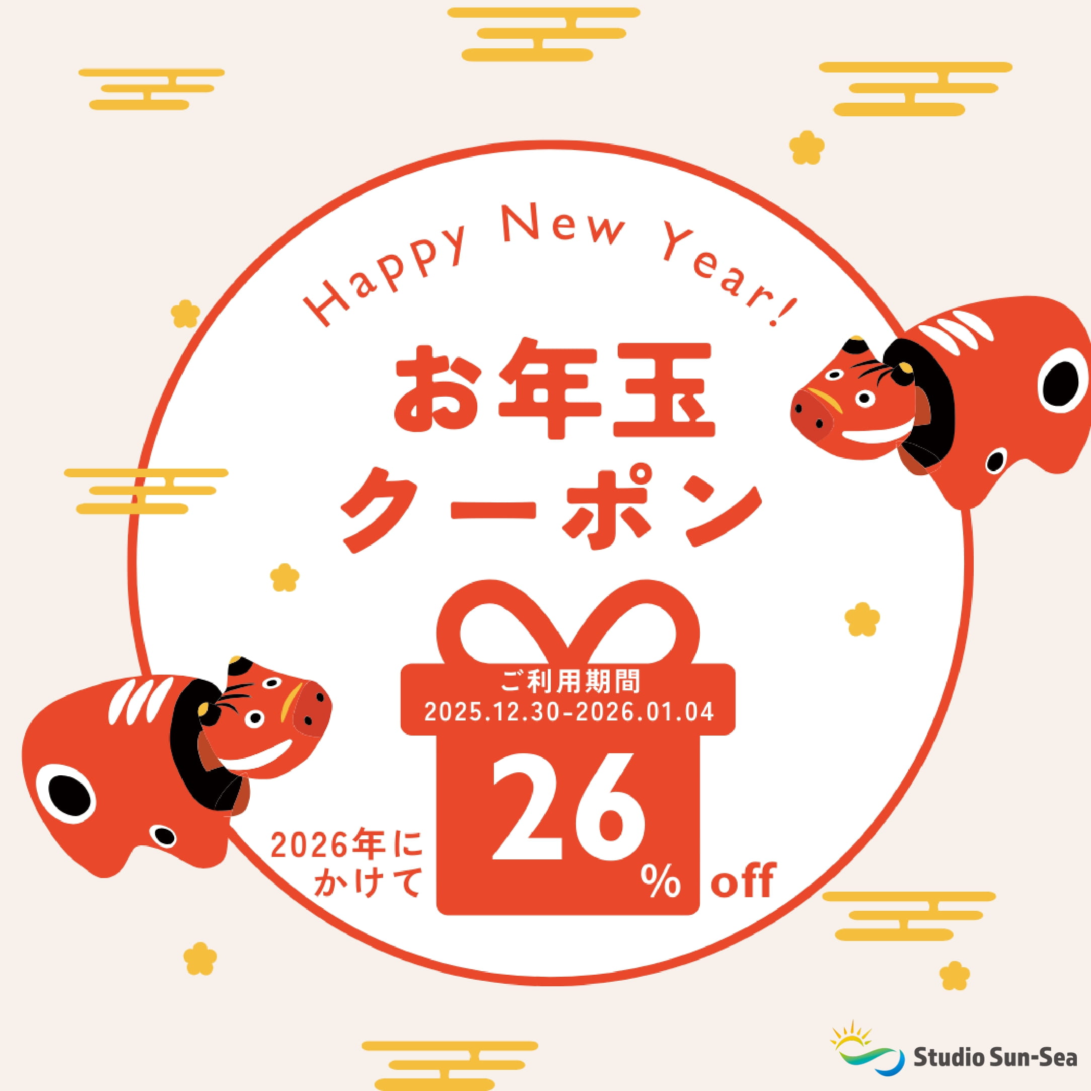 2025.12.28 【26%off】お年玉クーポン_2026.01 Studio Sun-Sea(スタジオ サンシー)では、 年末年始も通常通り営業いたします。 2026年を迎えるにあたり、日頃の感謝の気持ちを込めて 「お年玉クーポン 26%OFF」 をご用意いたしました。 本クーポンは、2026年の「26」にちなんだ特別企画です。 期間中は何度でもご利用いただけますので、 年末年始のリフレッシュや新年のスタートにぜひご活用ください。 ―――――――――― ■ クーポン内容 ・割引率:26%OFF ・期間:2025年12月30日~2026年1月4日 ・対象:公式LINEからのご予約 ※すでにご予約済みの枠は対象外となります ―――――――――― ※クーポンのご利用方法は、こちらをタップよりご確認ください。 ※「公式LINE」のご登録は、下記の「LINEから簡単予約」をタップしてご登録ください。 LINEから簡単予約 スタジオ サンシーは、 ダンス・ヨガ・ストレッチ・撮影・レッスンなど、 少人数で落ち着いてご利用いただける空間です。 皆さまのご利用を心よりお待ちしております。 ―――――――――― ◆◇◆◇◆◇◆◇◆◇◆◇ スタジオ サンシー/Studio Sun-Sea 自宅でも職場でもなく “自分らしく過ごせる場所” ●堀切菖蒲園駅 徒歩1分 ●LINEで簡単予約 ●無料高速Wi-Fi完備 ●多彩な照明演出 ●大型ミラー・音響設備完備 ◆◇◆◇◆◇◆◇◆◇◆◇ Tweet Share 【500円OFF】Christmasクーポン_2025.12 【祝】新年のご挨拶_2026.01