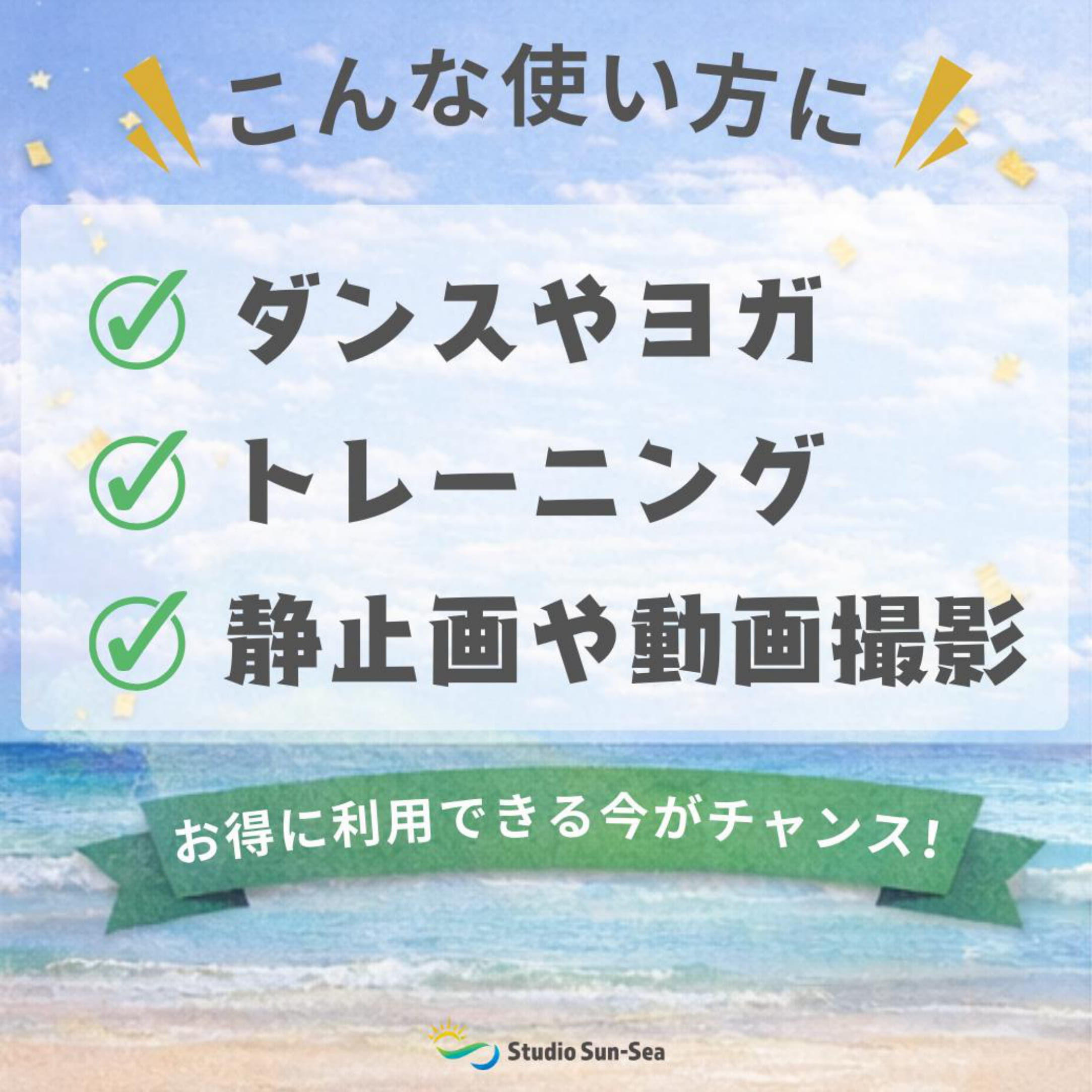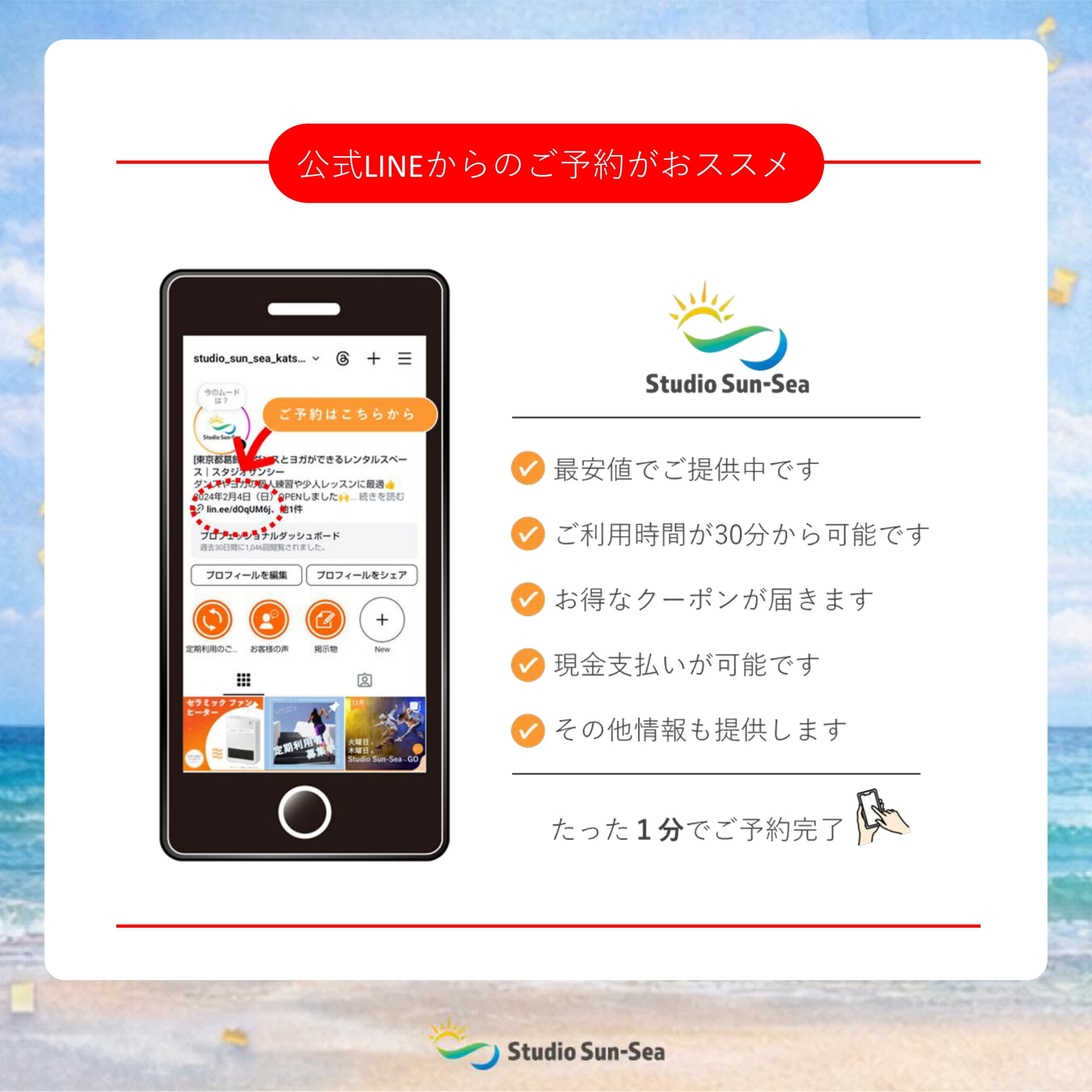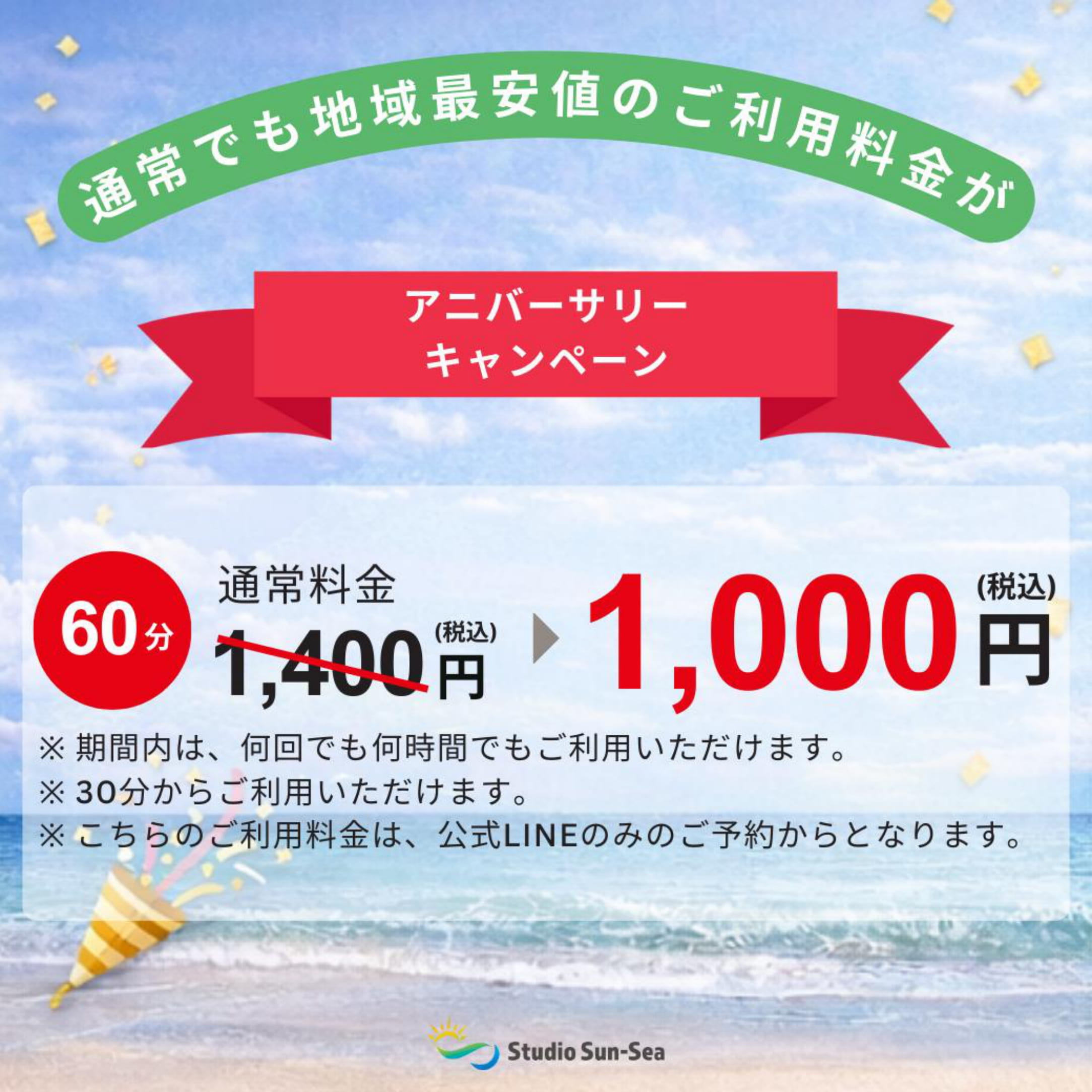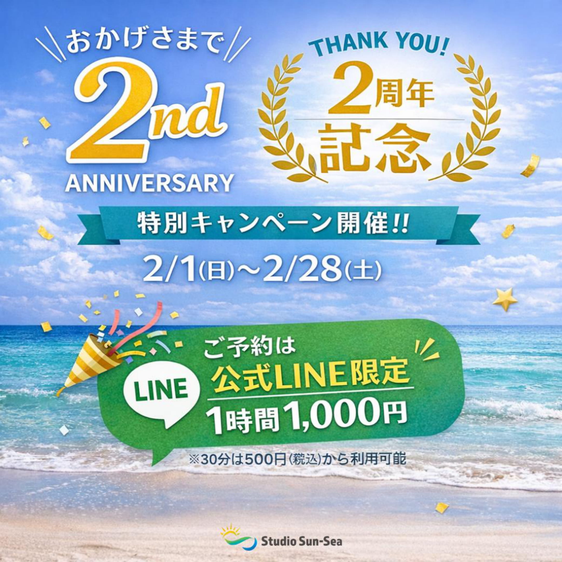 2026.01.27 【60分 / 1,000円】アニバーサリーキャンペーン_2026 Studio Sun-Sea(スタジオ サンシー)は、2026年2月で2周年を迎えます。 2周年を迎えられるのも、これまでご利用いただきました皆様のおかげです。 心より感謝申し上げます。 これまでの感謝の気持ちを込めて、 「2周年アニバーサリーキャンペーン」と題し、 1時間1,000円(税込)でご利用いただける、とてもお得なキャンペーンをご用意いたしました。 ◆◇◆ 2周年アニバーサリーキャンペーン ◆◇◆ 【概要】 期間:2026年2月1日(日)〜2月28日(土) 内容:上記期間内であれば、いつでも 1時間/1,000円(税込)でご利用いただけます。 ご利用回数:期間中、何回でも何時間でもご利用いただけます。 【重要】 ※30分からご利用いただけます。 ※30分刻みでご利用できるため、その場合は 30分/500円(税込)となります。 ※すでに2月のご予約がお済みの分は、本キャンペーン料金の適用対象外となります。 ※本キャンペーンの料金は、「公式LINE」からのご予約のみ対象です。 下記の「LINEから簡単予約」より、ご予約をお願いいたします。 LINEから簡単予約 Studio Sun-Seaは、ダンス・ヨガ・ストレッチ・動画撮影・教室開催など、 少人数でさまざまな用途にご利用いただけるレンタルスタジオです。 個人でのご利用も大歓迎ですので、この機会にぜひご活用ください。 最後に Studio Sun-Seaが2周年を迎えられたのは、これまでご利用くださった皆様のおかげです。 いつもご利用いただき、誠にありがとうございます。 これからも地域の皆様に愛されるスタジオづくりと運営に努めてまいります。 大変お得にご利用いただける2月、皆様の「好きなこと」が実現できる場所として、ぜひご活用ください。 初めての方も大歓迎です。皆様のご予約・ご利用を心よりお待ちしております。 ◆◇◆◇◆◇◆◇◆◇◆◇ スタジオ サンシー/Studio Sun-Sea 自宅でも職場でもなく自分の好きなことが実現できる場所、それが「スタジオ サンシー」です。 ★☆★ スタジオ サンシーの特徴 ★☆★ ●堀切菖蒲園駅から徒歩1分 ●LINEで簡単予約 ●無料超高速Wi-Fi ●利用用途に合わせた多彩な照明の演出 ●大型ミラーと大迫力スピーカー完備 ◆◇◆◇◆◇◆◇◆◇◆◇ Tweet Share 【必見】お客様のお声_2026.01 【必見】2時間あると、余裕が生まれる_2026.02